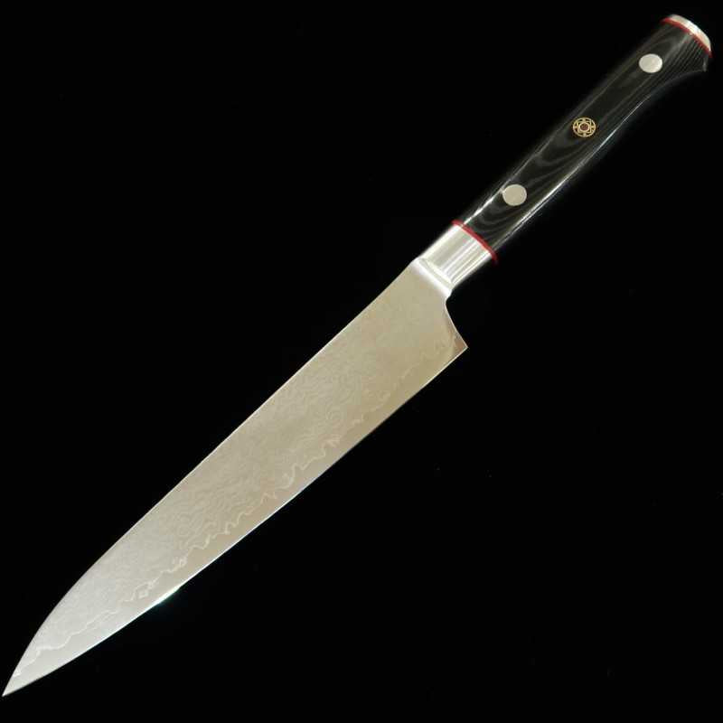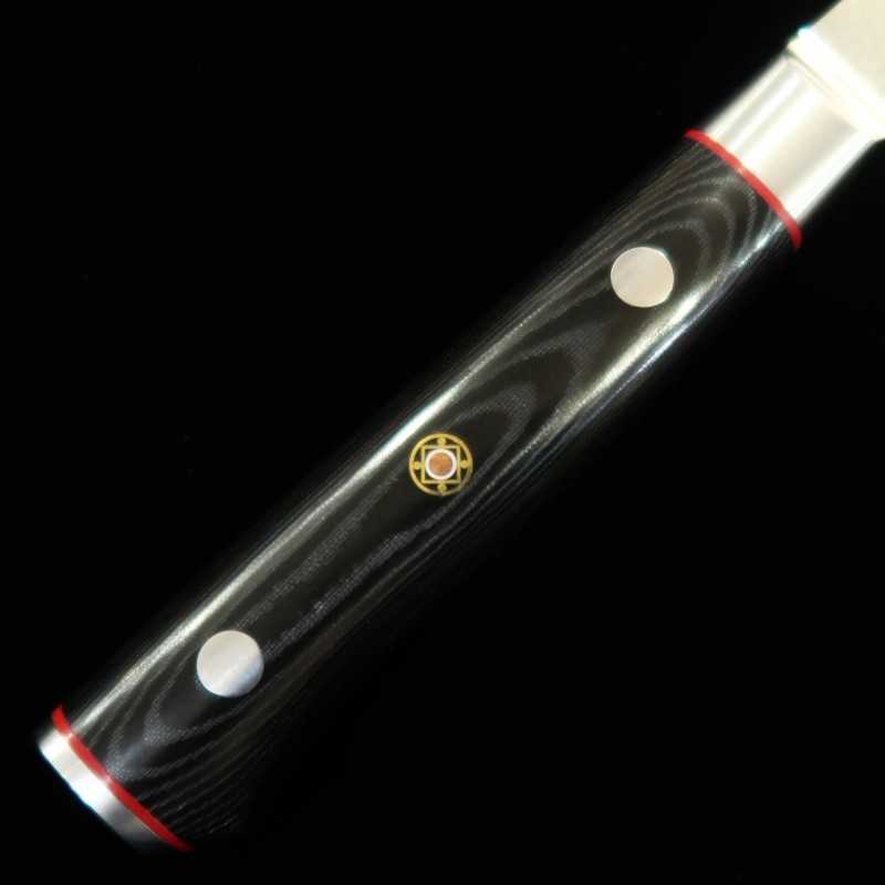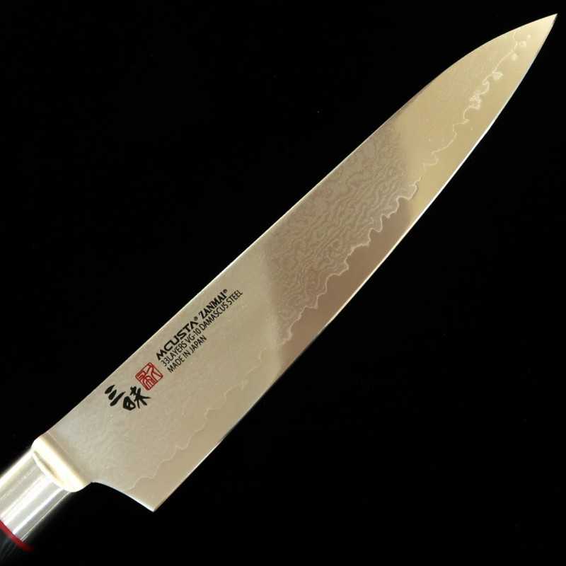 The butt plate has the logo of Zanmai engraved on it. The blade is made of VG10 and Damascus 33 layers, just like the Guren.
