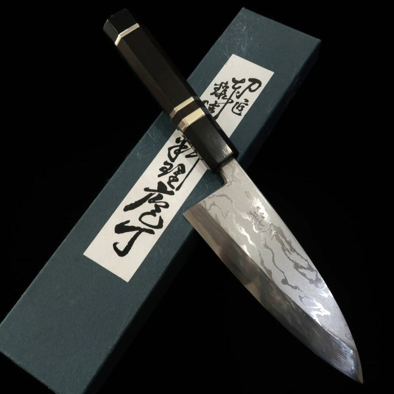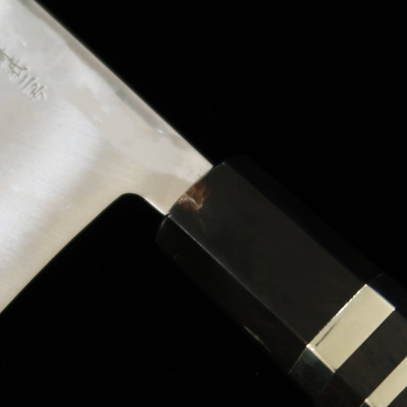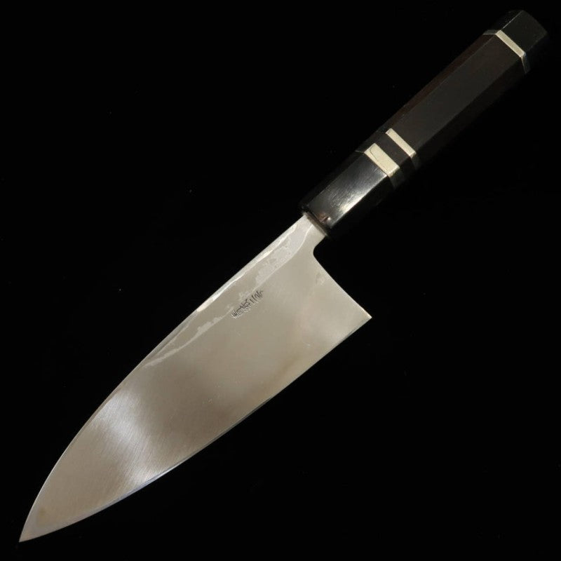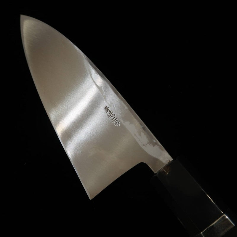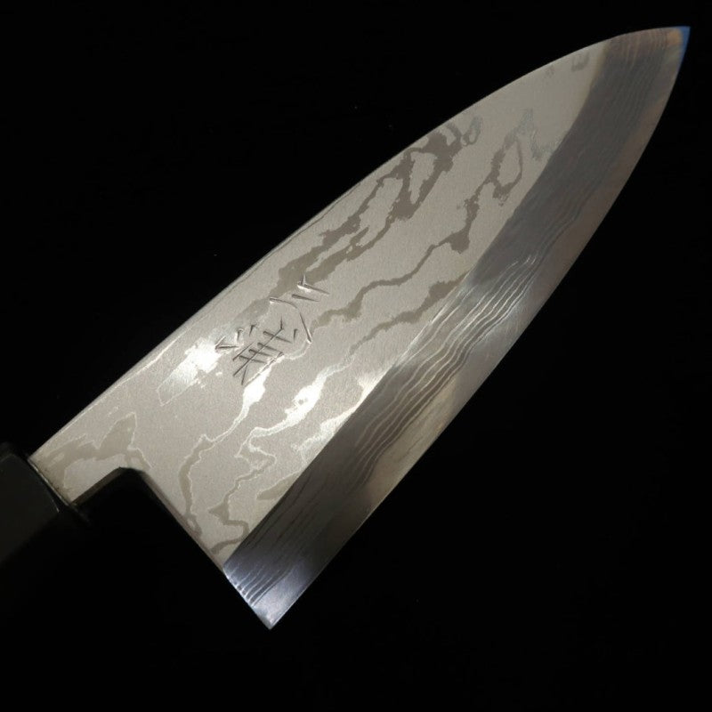 [OUTLET] MIURA Deba Afilado original Acero Aogami No.2 Damasco Mango de ébano con anillo de plata (150mm) Con grieta en el mango