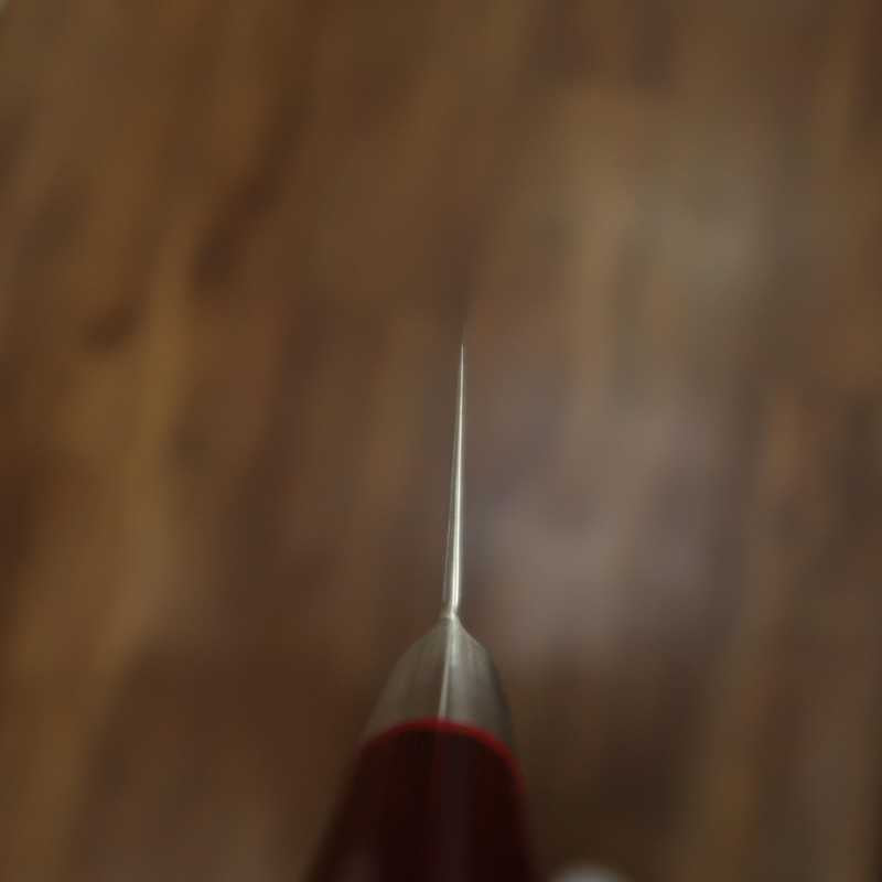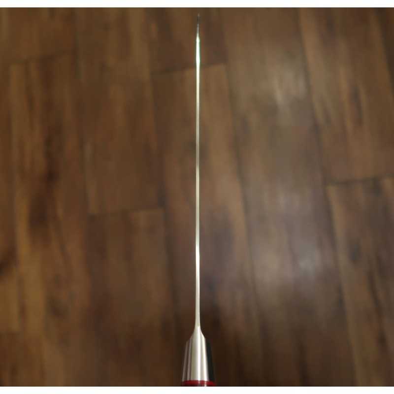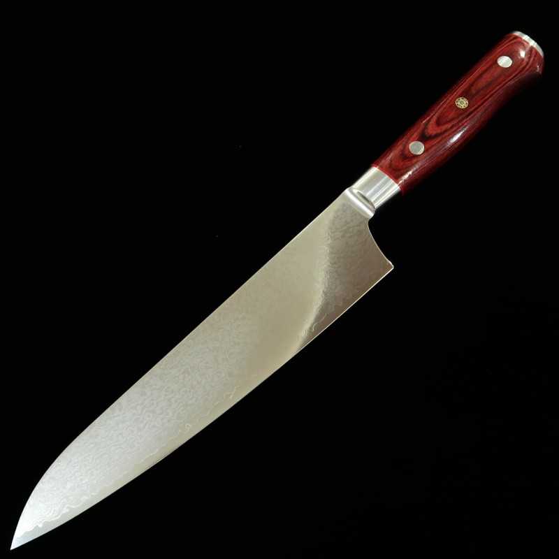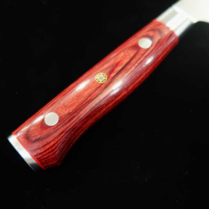 El producto más popular de nuestra tienda. Hoja de acero damasco de 33 capas que envuelve un núcleo de VG10. Mango rojo y robusto fijado con tres remaches de madera de carwood. Además, el extremo del mango lleva un espejo.
