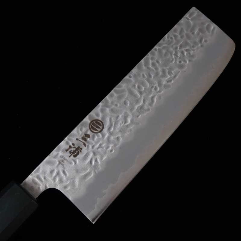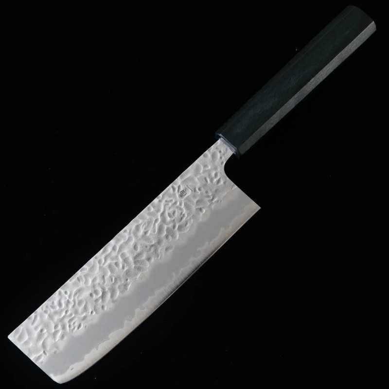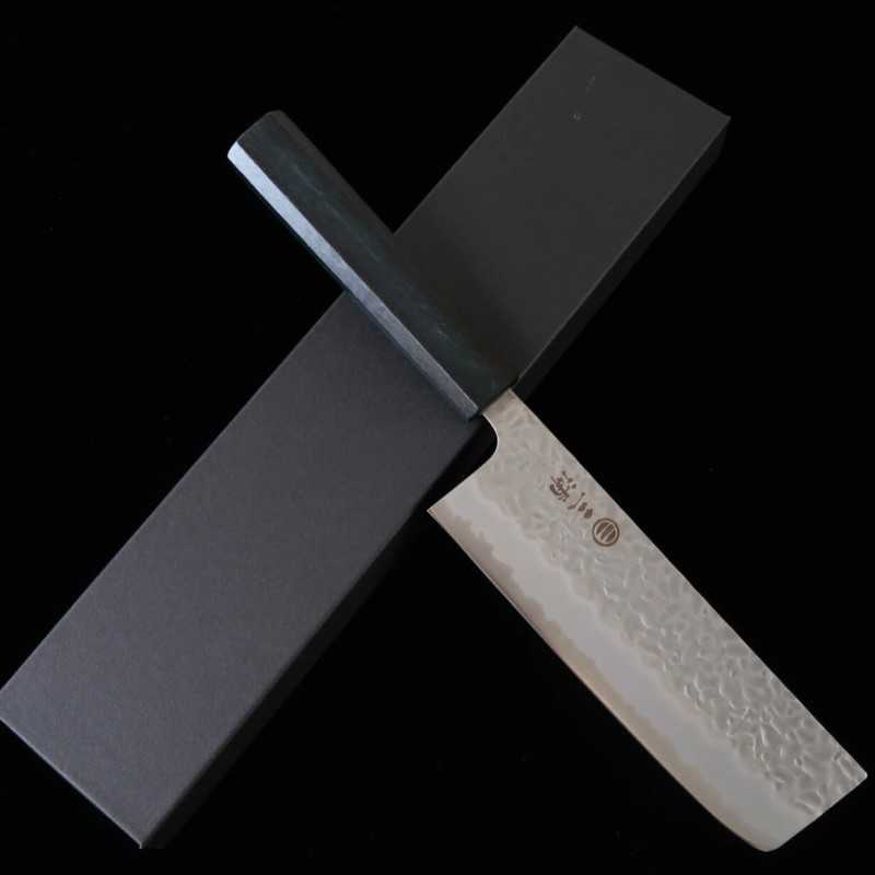 Nakiri MIURA Acero Shirogami nº1 con núcleo de acero inoxidable, acabado martilleado, mango octogonal azul índigo (165mm)