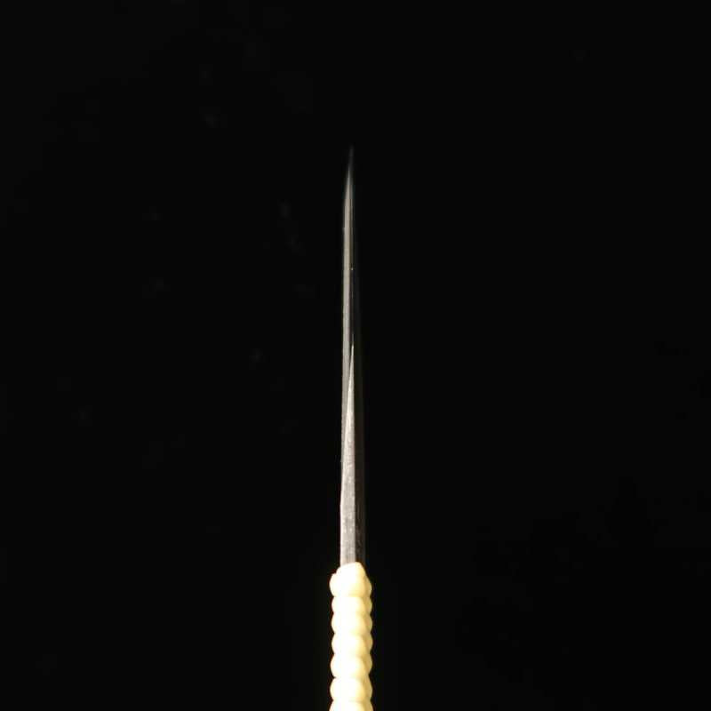 Es un cuchillo kiridashi avanzado con acero Aogami Super. El mango tiene forma de pistola curvada.