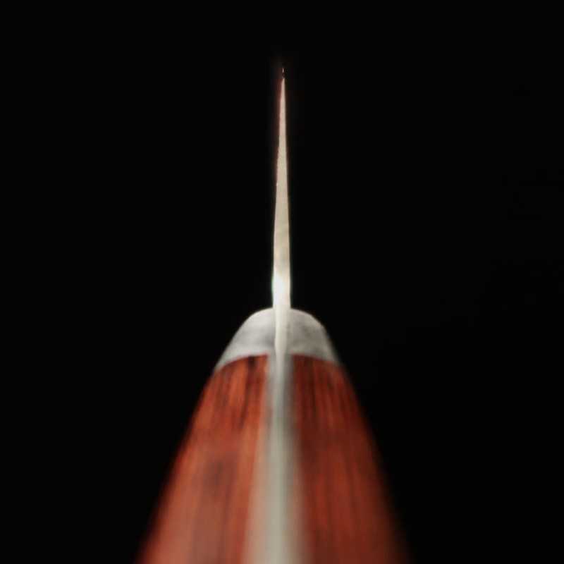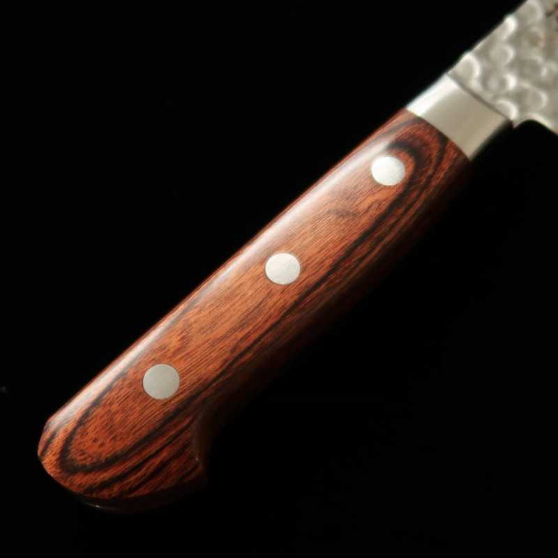 La lame VG-10 martelée à motif damassé est mise en valeur par un manche en contreplaqué acajou luxueux.
