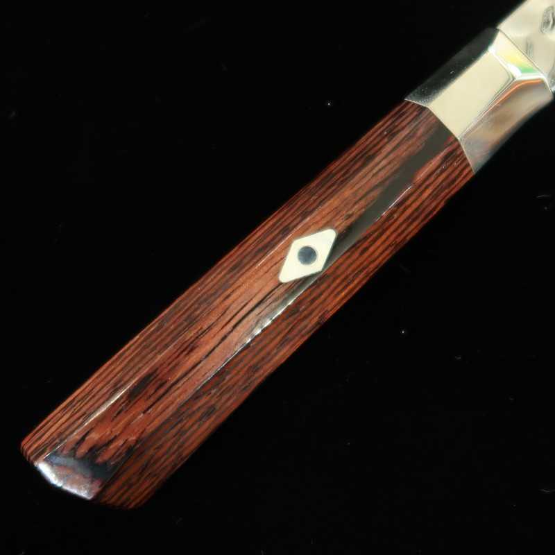 A lâmina com padrão damasco ondulado preciso contrasta com o acabamento martelado artesanal, polido em espelho, que confere luxo e imponência.