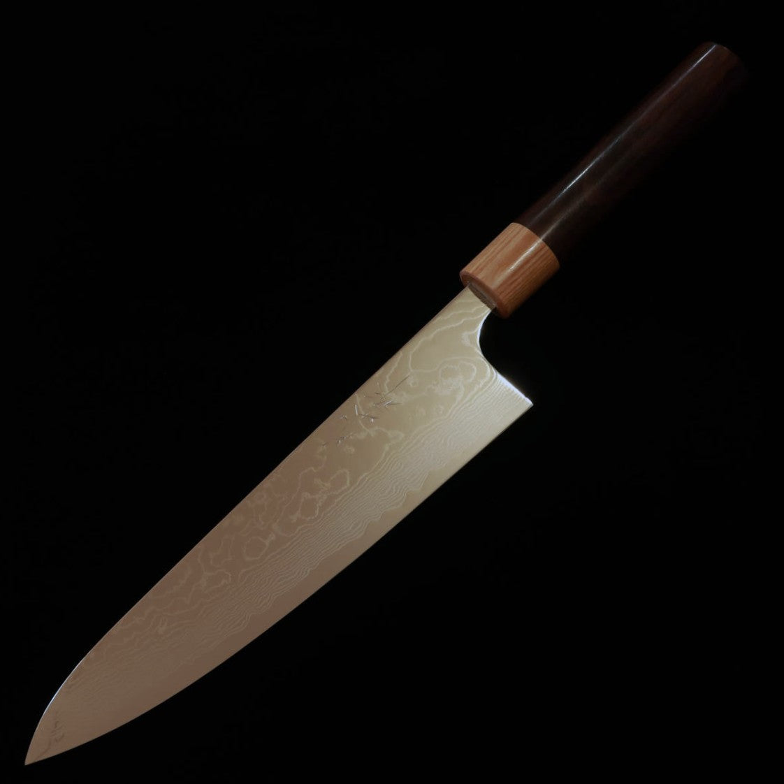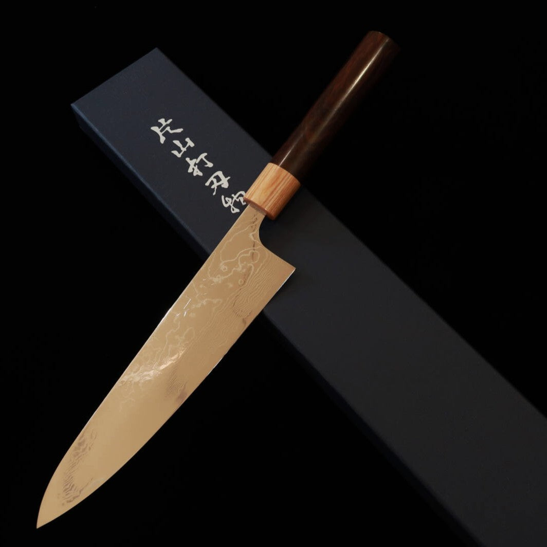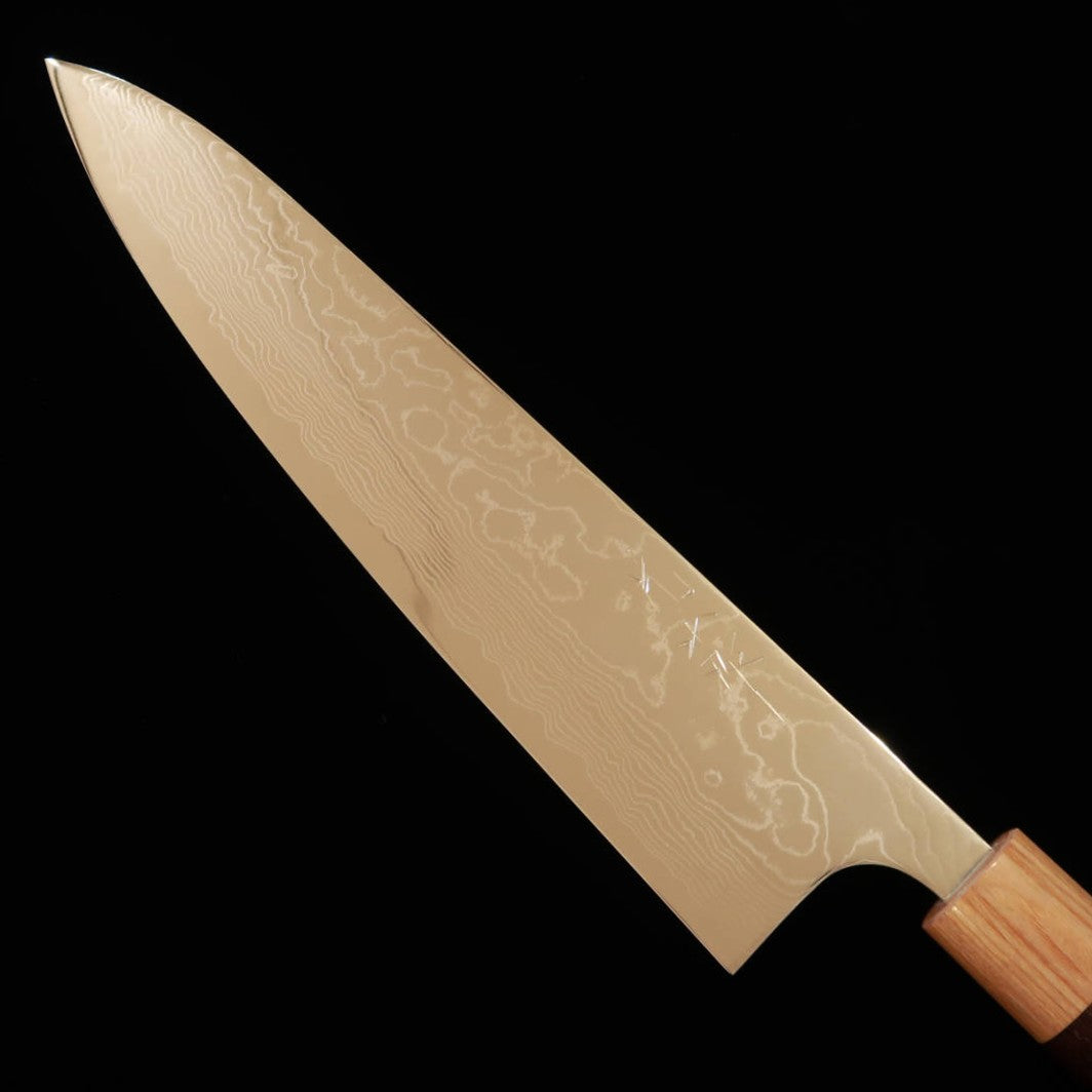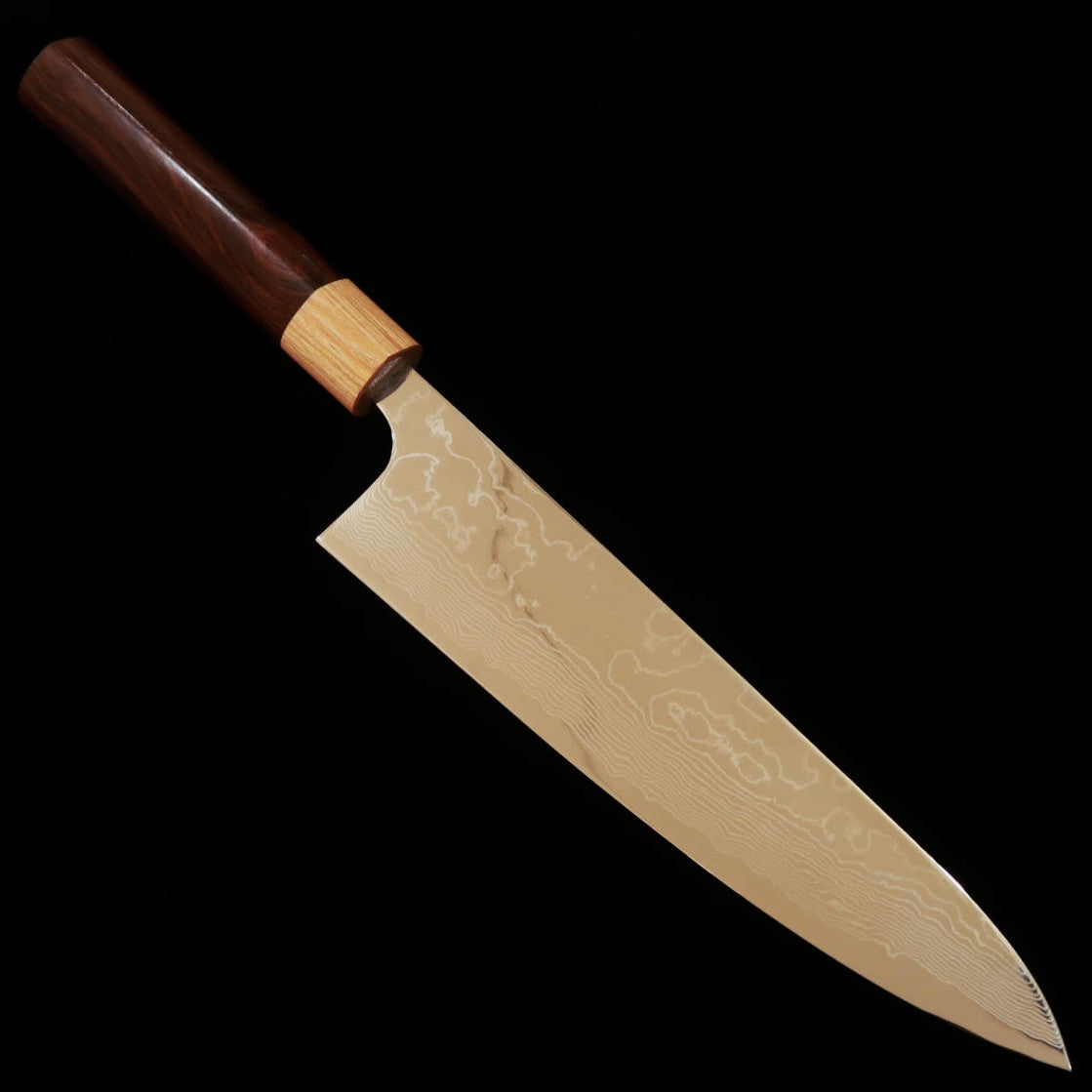 Gyuto Yuta Katayama Inox VG10 com acabamento polido em damasco e cabo de jacarandá castanho (210/240mm)